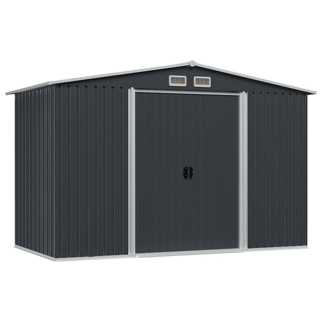 This metal storage shed will be a great addition to any back yard, lawn, or garden area. It is ideal for storing garden tools, lawn care equipment, household items, and much more! Practical design: This storage shed has 4 vents, 2 in the front and 2 in the rear, ensuring excellent ventilation. The double sliding doors in the front allow easy entry and exit.Durable material: The galvanised steel construction makes it durable and strong, so it won't corrode or be otherwise affected by extreme weather. It also includes a steel floor frame which adds stability and is perfect for a wood floor finish (wood not included).Easy to assemble: The pre-cut, pre-drilled parts and the included instruction manual ensure fast and easy assembly.Good to know:To prevent damage from heavy snow buildup, we recommend clearing the roof regularly during winter.