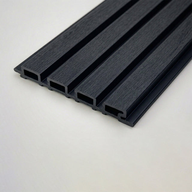 The boards are made from a stable wood-plastic composite blend that resists warping, swelling and colour change. The slatted profile produces sharp lines and clean geometry across the wall surface. With colour-matched Black trims, the finished installation looks premium and requires almost no upkeep.