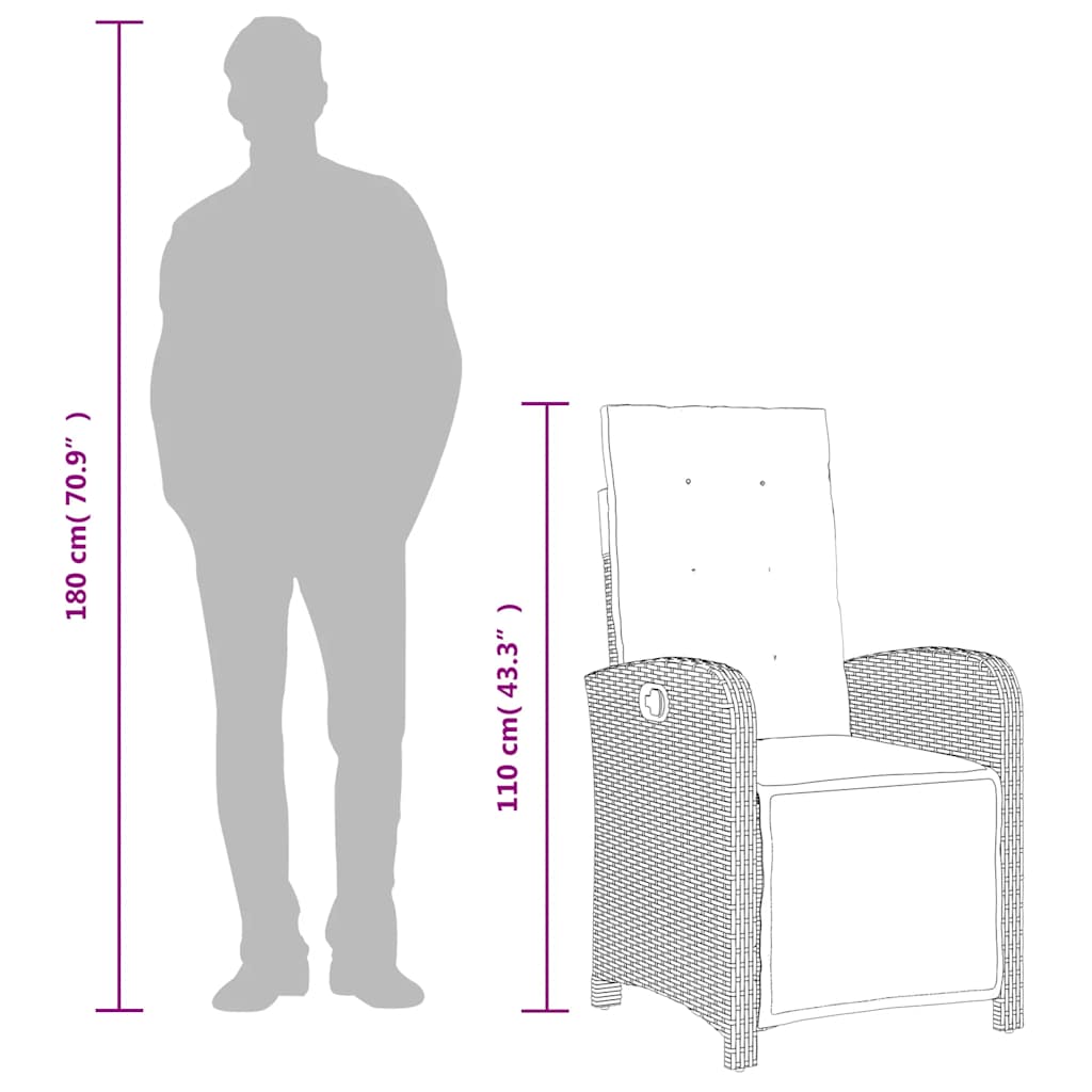 Enjoy a cup of coffee or have a chat with your family and friends in the garden, backyard, or on the balcony with this comfortable garden dining set! Durable material: PE rattan, also known as poly rattan, is a strong, low-maintenance synthetic material that looks like natural rattan. It's lightweight, easy to clean, and commonly used for outdoor furniture due to its durability and weather-resistant properties.Adjustable backrest and footrest: This garden seat has a handle. You can adjust the backrest and footrest to any position by pulling the handle, and quickly return them to their original positions.Comfortable seat experience: This outdoor furniture, complete with thickly padded cushions, offers a comfortable seating experience.Removable and washable cover: These seat cushions feature removable covers for easy washing and maintenance. The back cushions have a flap at the back for easy attachment to the backrests.Glass tabletop: The outdoor table's top is made from strong and durable tempered glass, making it easy to clean with a damp cloth and adding a touch of elegance to your outdoor space. Good to know:To make sure your outdoor furniture stays beautiful, we recommend protecting it with a waterproof cover.